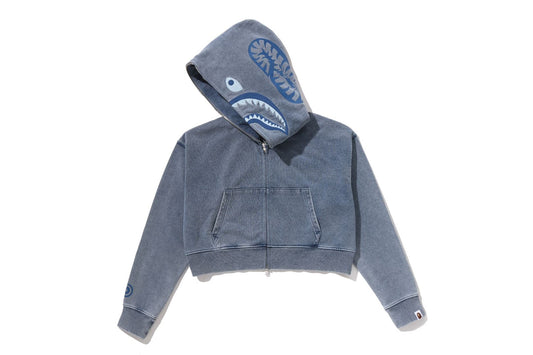 BAPE HEAVY WASHED INDIGO SHARK CROPPED FULL ZIP HOODIE