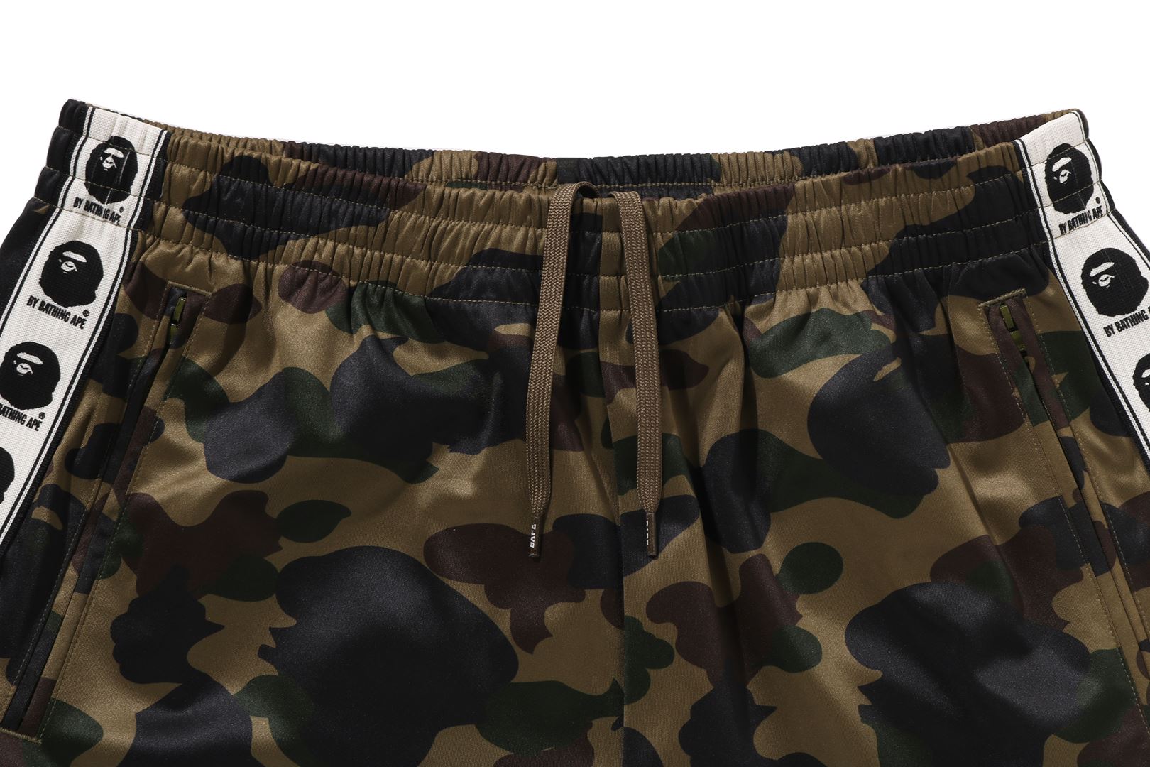 1ST CAMO圖案在左大腿部分印有BY BATHING APE的設計。