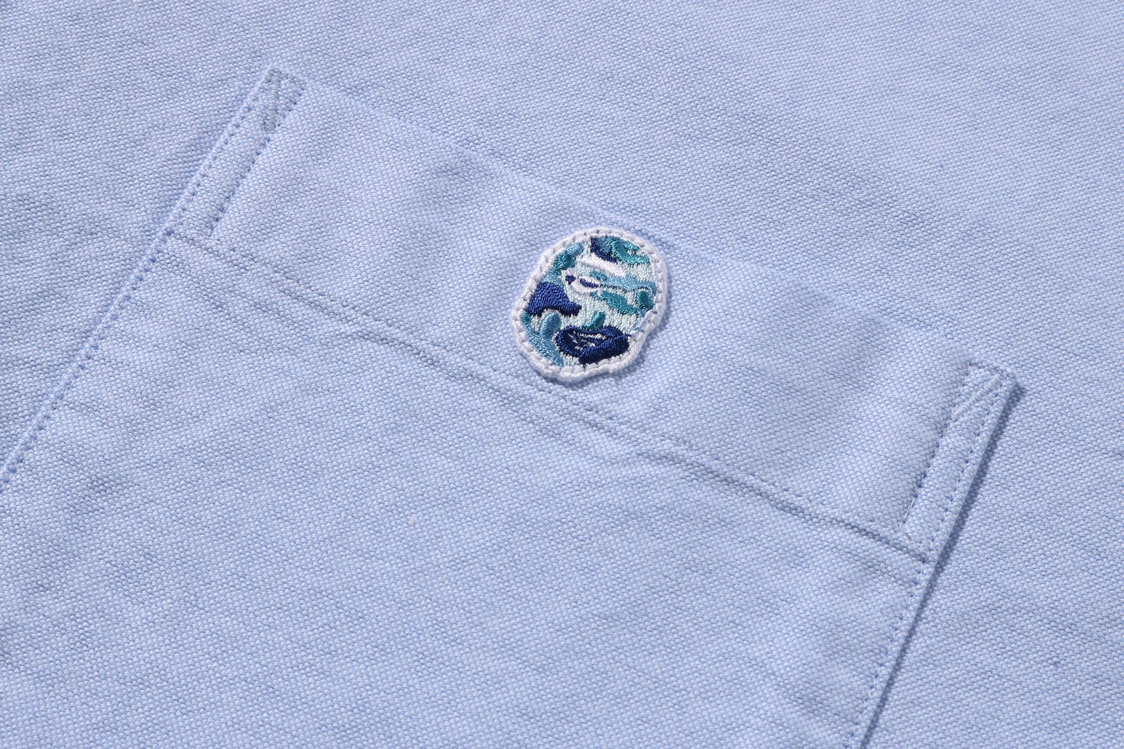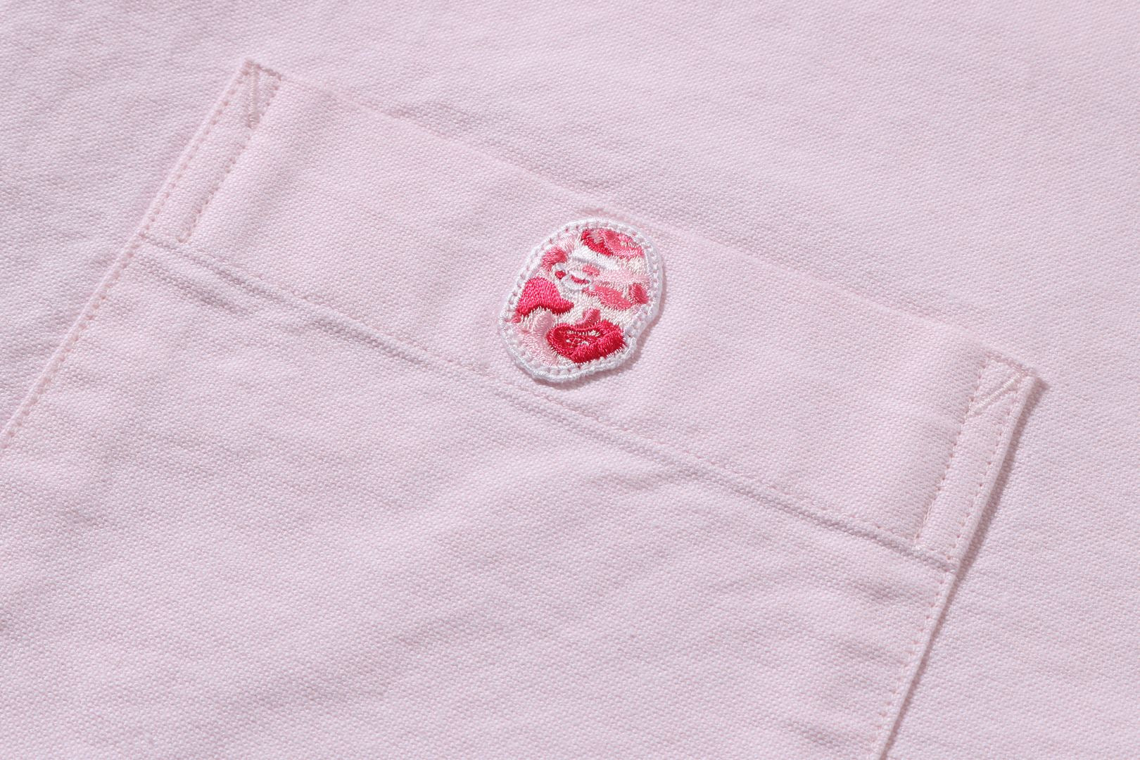 左胸口袋部分設計有ABC CAMO圖案的APE HEAD刺繡徽章。